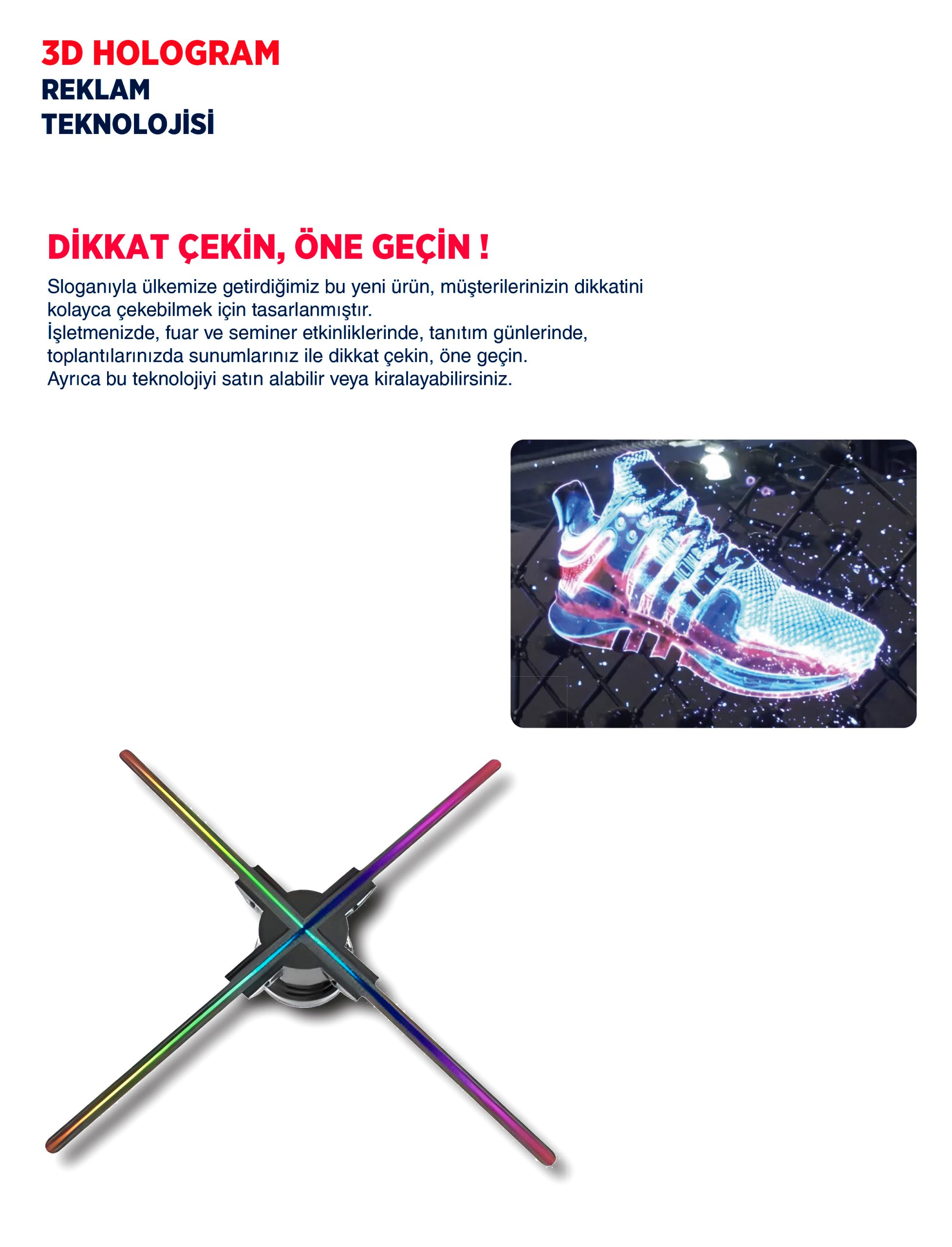 “Dikkat çekin, öne geçin!” sloganıyla ülkemize getirdiğimiz bu yeni ürün, müşterilerinizin dikkatini kolayca çekebilmek için tasarlanmış 3D hologram teknolojisine sahip yeni bir reklam aracıdır.